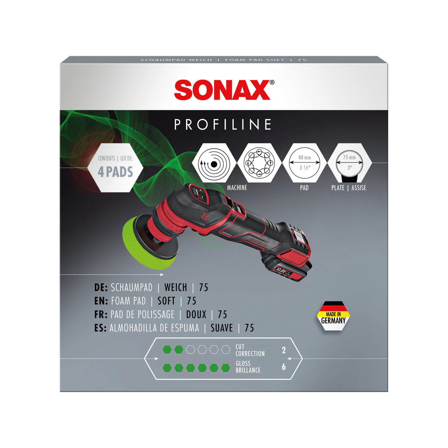 Das SONAX PROFILINE Pad-System ist konsequent nach Schneidleistung gestaffelt und arbeitet mit den passenden Polituren zusammen. Der SchaumPad weich steht am unteren Ende der Schneidleistungskurve — in Kombination mit dem SchaumPad medium und dem SchaumPad hart ergibt sich ein vollständiges Korrektursystem, das für nahezu jeden Lackzustand eine passende Kombination bereithält.
